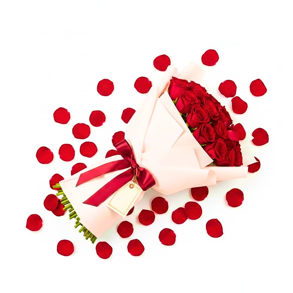 Bouquet de roses rouges, longues tiges avec feuillages, le tout enveloppé d’un joli papier.
