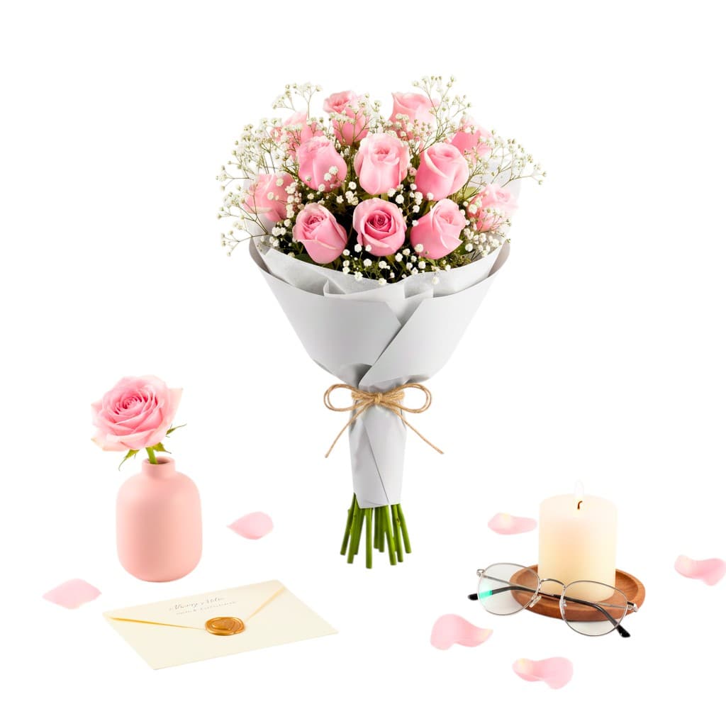 Bouquet de fleurs avec 24 roses roses plus feuillages, le tout enveloppé de papier.
