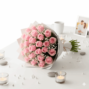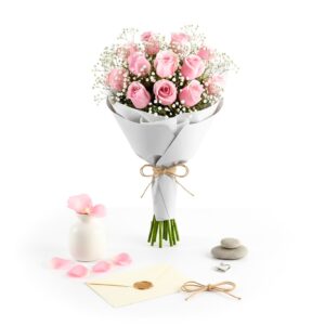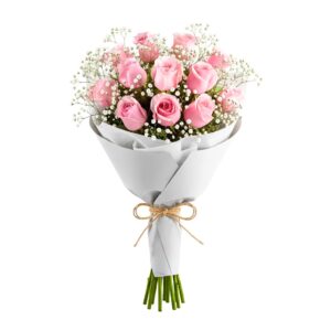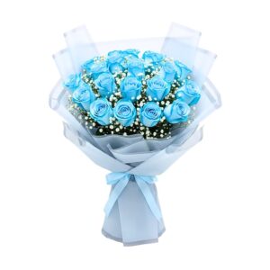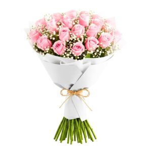 Bouquet de fleurs avec 36 roses de couleurs variées plus feuillages, le tout enveloppé de papier.
