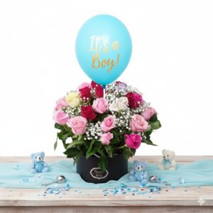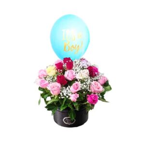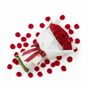 Bouquet de fleurs avec 36 roses de couleurs variées plus feuillages, le tout enveloppé de papier.