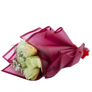 Bouquet de fleurs avec 36 roses de couleurs variées plus feuillages, le tout enveloppé de papier.