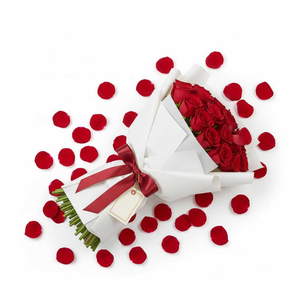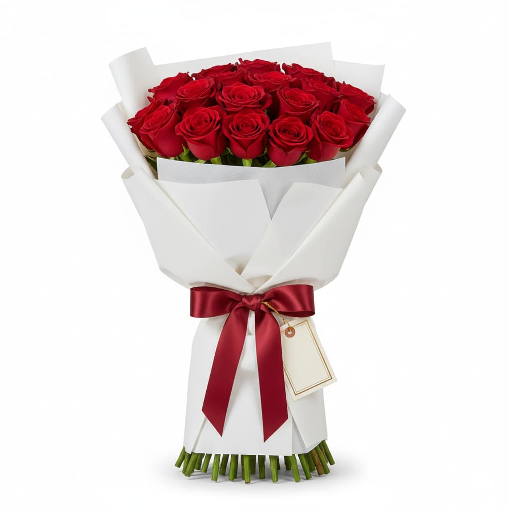 Bouquet de roses rouges, longues tiges avec feuillages, le tout enveloppé d’un joli papier.