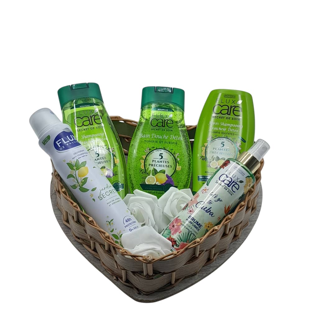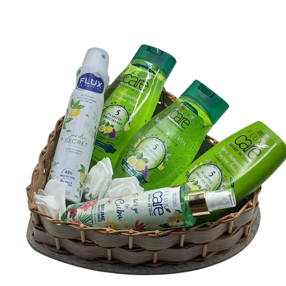 Un magnifique panier cadeau composé de produits de soin inspirés de la nature pour une sensation de fraîcheur et de bien-être. Ce coffret contient un shampooing, un après-shampooing et un gel douche de la gamme Flux Care, un déodorant parfumé de Flux Passion ainsi qu’une brume parfumée pour le corps.
