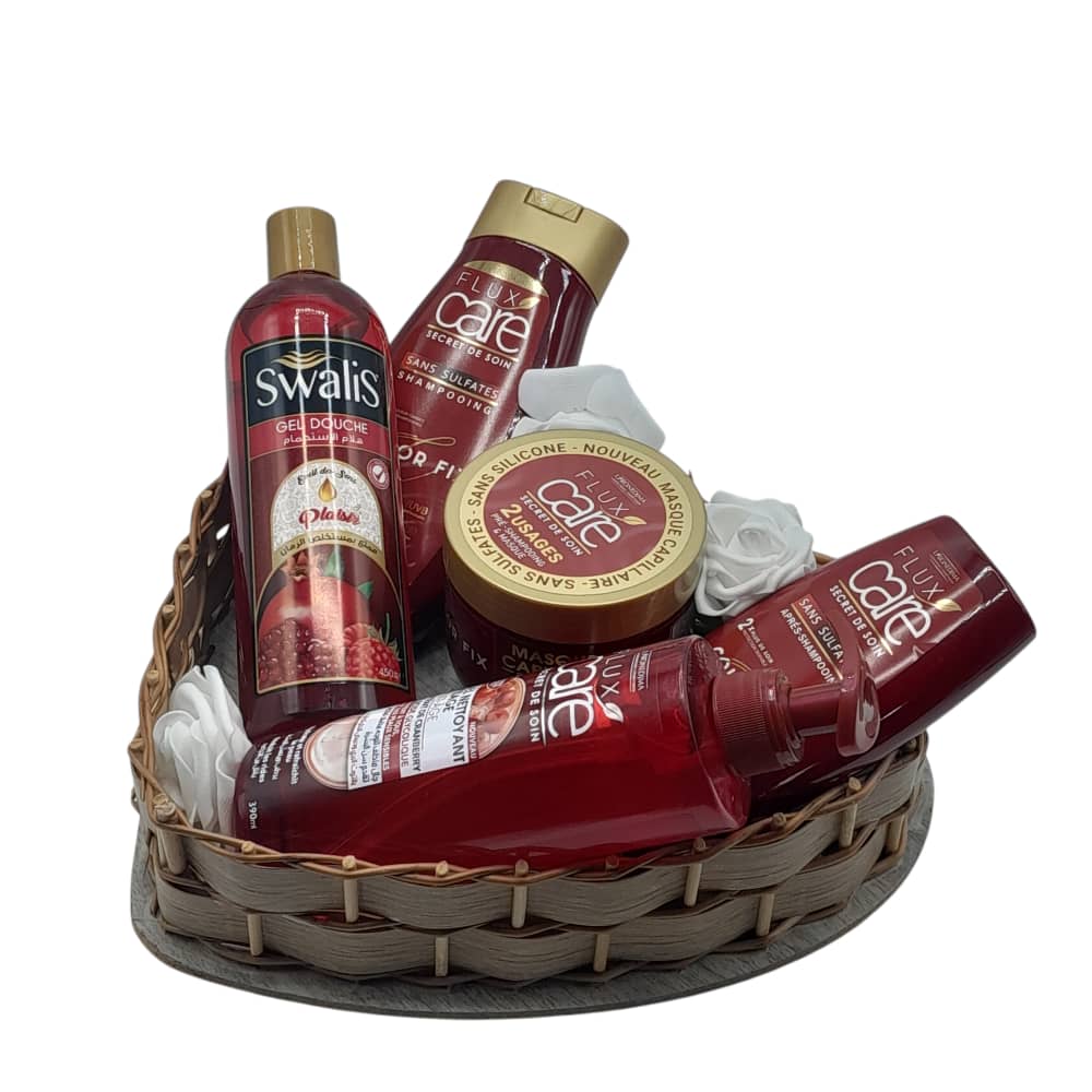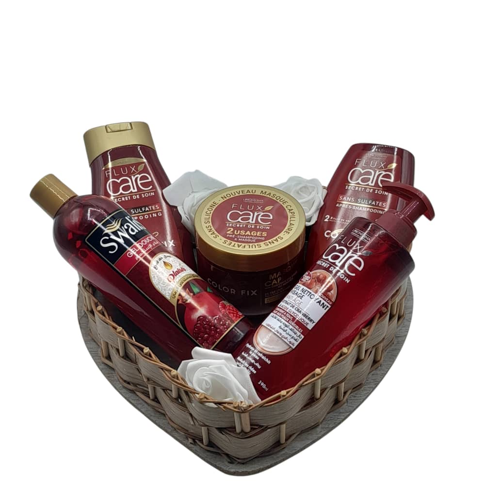 Offrez un magnifique panier cadeau composé de produits de soin pour les cheveux et le corps. Ce coffret élégant contient un shampooing, un après-shampooing, un masque capillaire de la gamme Flux Care ainsi qu’un gel douche parfumé de la marque Swalis.